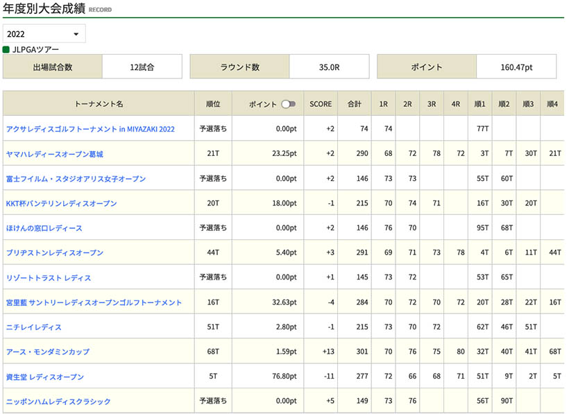 それでも今月頭の資生堂レディスで今季最高の5位に入るなど復調気配。3パット率の記録に挑みながらも好成績を挙げてシード権維持、そして日本初優勝を実現させてほしいものだ。