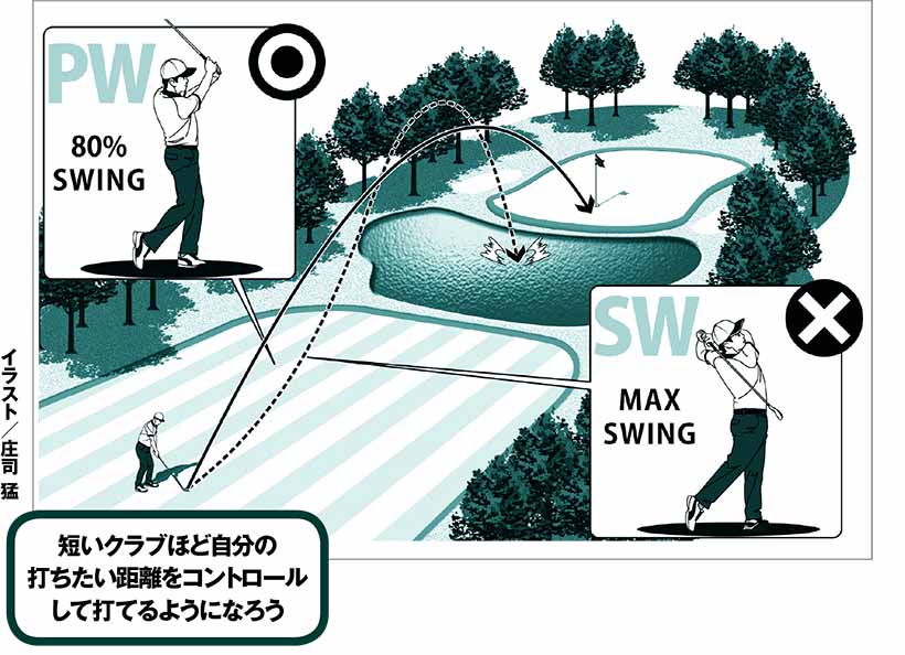 当たれば飛ぶかもしれませんが、当たらなかったら飛距離が20〜30ヤード減で、方向も左右に大きくブレてはスコアになりません。プロたちはその気になればサンドウェッジで100ヤード飛ばせるでしょうけれど、飛ばすためのクラブではないのでフルスイングは絶対にしません。繰り返しますが、アイアンは自分の打ちたい距離を正確に打つのが一番の目的。とくにウェッジのように距離をコントロールしたいショットにおいてフルスイングはタブーです。