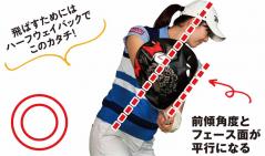 ○ハーフウェイバックではフェースが地面と垂直(時計の12時)にしようとする人が多いが、飛ばすためにはフェースは垂直よりも閉じる。前傾角度と平行になるくらいの角度が理想。