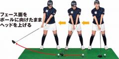 フェースを開かないためには、フェース面をできるだけボールを向けたままヘッドを上げることが大切。ヘッドを「体の横」に動かすのではなく、「ボールの後ろ」に動かすことがポイント。