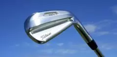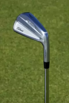 「すみません、ついつい見とれて。まずトップブレードが薄くてシャープ。斜めに削ることで実際の厚さよりもさらに薄さを演出しています。構えたら2ミリくらいにしか見えませんね。微妙に入ったグースからスッと反り返るようにフェースを逃した感じ。また、僕がタイトリストで大好きなトゥの曲線にも磨きがかかっています。シャフトはNSの105T。これは専用設計のようです」