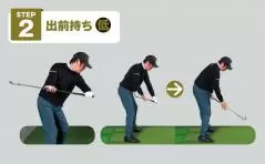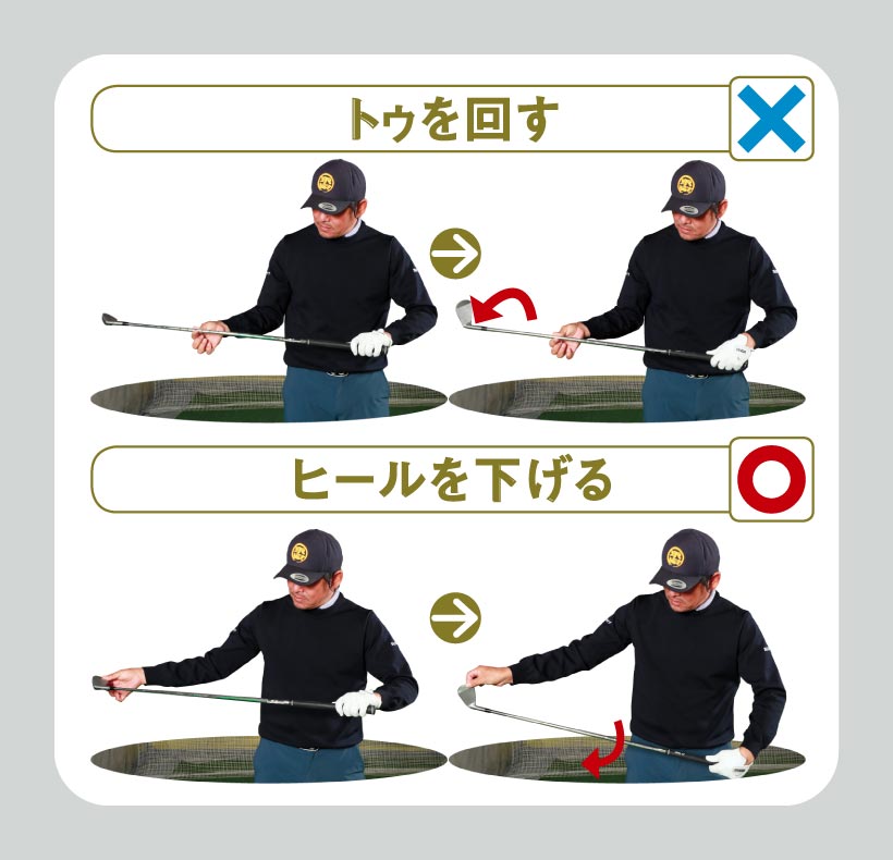 「ボールを厚くとらえて弾道を強くする、インパクトエリアでフェースを立てていく“タテ回転”の動きも、トゥ上を被せていくのではなく、ヒール下を下げてターフを削っていくイメージのほうが、スムーズにヘッドを走らせつつ、しっかりボールをつかまえることができます」