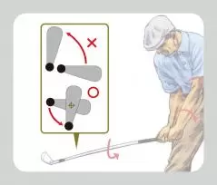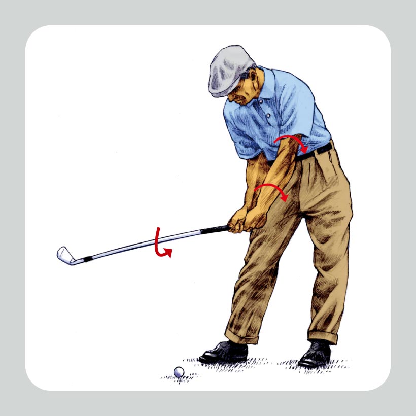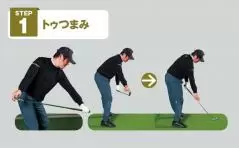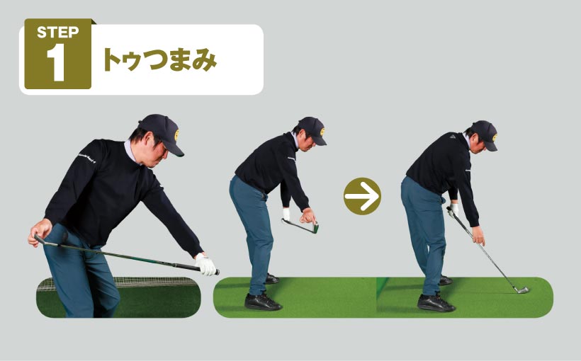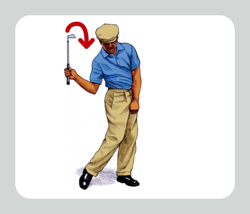 ハーフウェイダウンの位置でフェースをほぼ水平にし、右手でヘッドのトゥ上をつまむ。つまんだ所を軸に、シャフトとヒールを下げながらヘッドを引き下げ、途中で右手を離す。リリースされたヘッドのターンする感覚をつかむ。