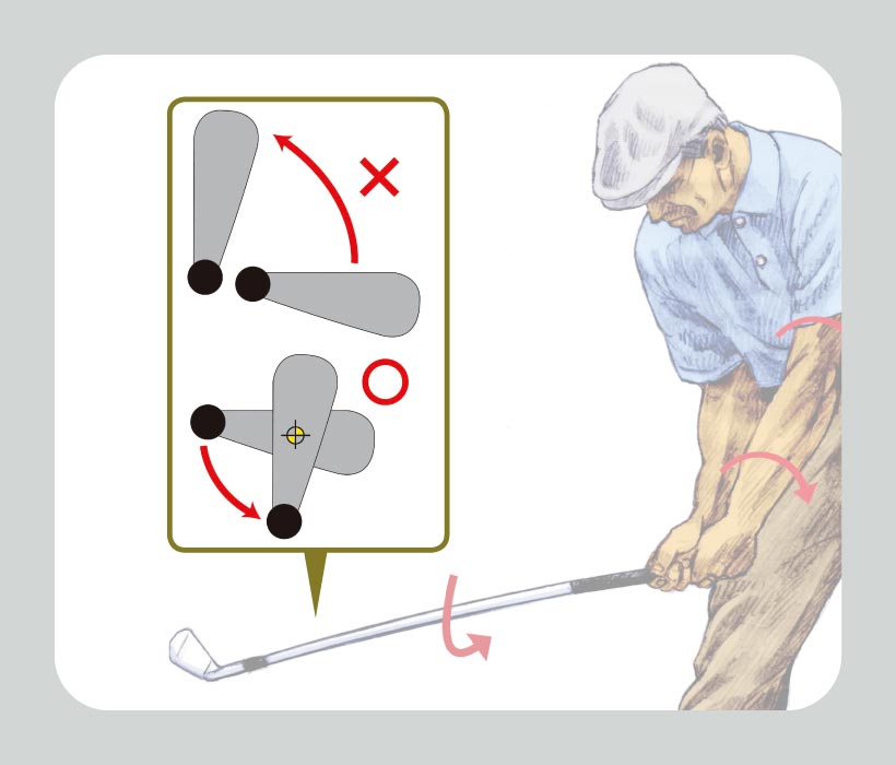 「ホーガンはダウンで、振り上げたプレーンよりインサイドから下ろすイメージを重視していましたが、これは手元をヘッド軌道より下げるイメージ。ヘッドのトゥを軸に、ヒールとシャフトを下げる動きになります。舟の櫓を漕ぐように、シャフトを移動させてヒール側を〝開く〟わけです。こうすると、確実にフェースを戻せます」