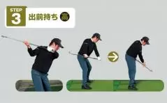 右肩の高さで、シャフトもフェースもほぼ水平に。ハーフウェイダウンの位置に下ろすまではたぐり動作を入れないイメージ。これがタメにつながり、インサイドから叩ける体勢につながる。リリースまでの一連の流れを感じ取る。