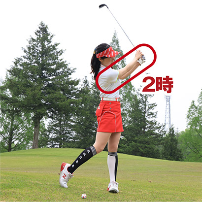 傾斜地のショットはトラブルショットの一つですから、最良の結果を求めないようにしましょう。あまり距離が出なくてもいいからグリーンに近づけたら大成功という具合に考えてください。斜面には4種類がありますが、スイングの力感をフルショットの6〜7割くらいに抑えてコンパクトにスイングすることが共通項目です。最大でもトップの左腕は時計盤の10時、フィニッシュの右腕は2時くらいまでのイメージです。それ以上クラブを大きく振ると下半身がよろけたり、上体が起きたりしやすいのでアドレスの前傾姿勢や両ヒザの高さをキープできる範囲でスイングすることが重要です。コンパクトに振るためにも、ツマ先下がり以外はクラブを通常よりも1インチ(2・54センチ)くらい短く持ちましょう。