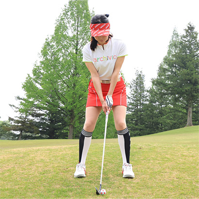 ・下半身が不安定になりやすいツマ先下がりは腰を落とし、重心を低くして構える