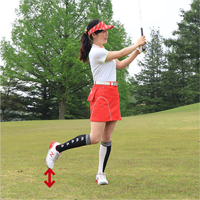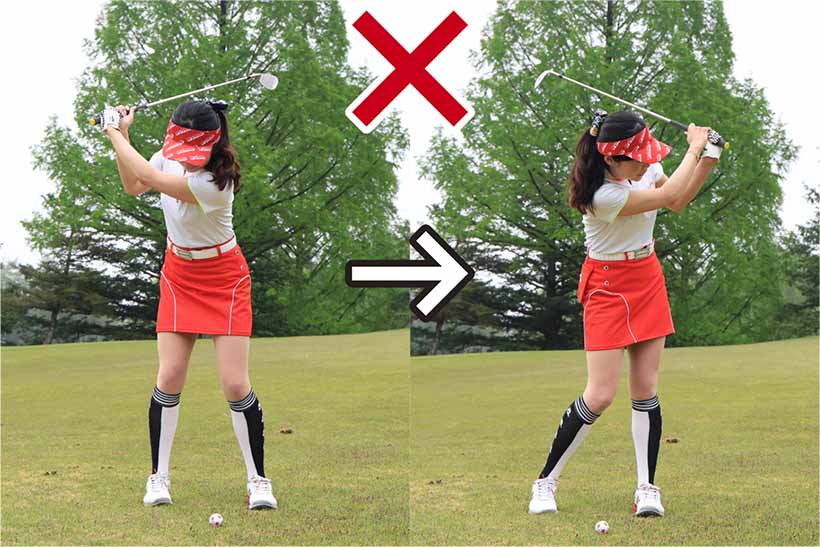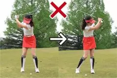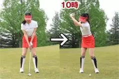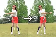 小さめのスイングだからといって手先だけの動きでクラブを振ってはいけません。バックスイングで左ヒジが折れ曲がったり、フォロースルーが小さくなったりするとインパクトの打点が安定しにくく、方向性も距離感もブレやすいのです。バックスイングは右隣りの人と左手で握手するイメージで左腕を自然に伸ばし、フォロースルーは左隣の人と右手で握手するイメージで右腕を自然に伸ばしましょう。小さめのスイングでもカラダの張りを感じながらスイングすることが大事なポイントです。
