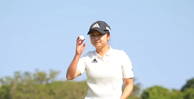 西村優菜に1打差単独首位で迎えた15番の第2打が大シャンク。テレビ解説をしていた服部道子が思わず「何かありましたかね」と口にしたほど大きく右に飛んだボールは林に入り、このホールボギーでバーディーの西村に逆転された。