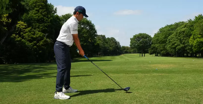ショット前にボールの後方に立ち、ボールと目標を結ぶ飛球線をイメージします。そこまではきちんと実行していても、アドレスを作る段階でほとんどの人がカラダの向きを間違えてしまうのです。もっとも多いパターンはスタンスがクローズで、肩はオープン。両足のラインは目標の右を指しているのに、肩のラインが目標の左を向いてしまうチグハグな姿勢です。遠くの目標ばかりを見ているとカラダが右を向きやすくなります。でも肩を右に向けると目標が見づらいから肩だけを無意識に開いてしまいがち。それにドライバーはボールを左カカト内側の延長線上付近にセットするので、どうしても肩が開きやすい。結果的にアウトサイドインの軌道となり、スライスやヒッカケなどのミスが生じやすいのです。