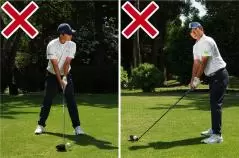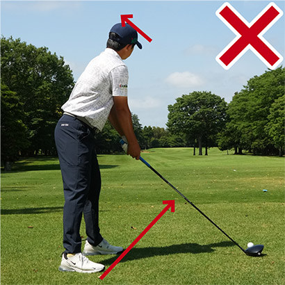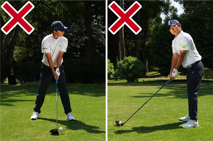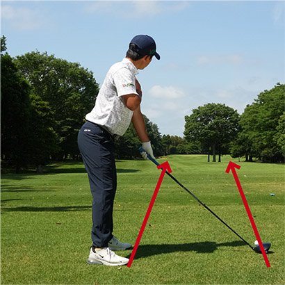 ショット前にボールの後方に立ち、ボールと目標を結ぶ飛球線をイメージします。そこまではきちんと実行していても、アドレスを作る段階でほとんどの人がカラダの向きを間違えてしまうのです。もっとも多いパターンはスタンスがクローズで、肩はオープン。両足のラインは目標の右を指しているのに、肩のラインが目標の左を向いてしまうチグハグな姿勢です。遠くの目標ばかりを見ているとカラダが右を向きやすくなります。でも肩を右に向けると目標が見づらいから肩だけを無意識に開いてしまいがち。それにドライバーはボールを左カカト内側の延長線上付近にセットするので、どうしても肩が開きやすい。結果的にアウトサイドインの軌道となり、スライスやヒッカケなどのミスが生じやすいのです。
