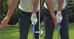 クラブを正しい軌道に乗せてグッドショットを打つためには両手をバランスよく握ることが絶対条件です。ミスショットが出やすいグリップの例として、右手のルーズな握り方を真っ先に取り上げたいと思います。右手はグリップの上から握っても、下から握ってもダメ。上から握ると右手がかぶりすぎてバックスイングでクラブがアウトサイドに上がりやすくなります。下から握った場合は右手の握りが浅くなりすぎてバックスイングでクラブはインサイドに低く上がりすぎてしまいます。