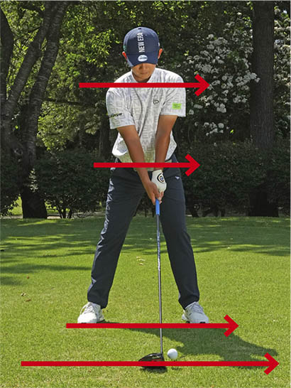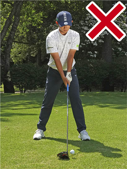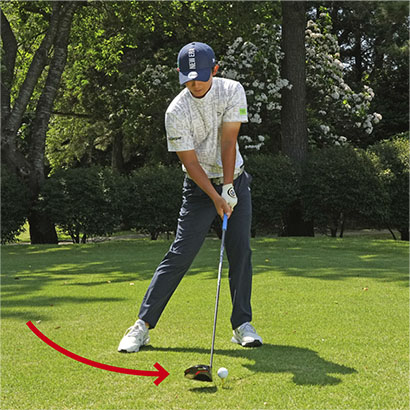 ゴルファーの約8割近くがスライスに悩まされているという話をよく耳にします。確かにドライバーは一番スライスが出やすいクラブです。シャフトが長く、ロフト角が少ない。それにボールを左カカト内側の延長線上にセットするのが基本ですからアドレスで肩のラインが開きやすい。シャフトが長いぶん、振り遅れになりやすくフェースが開いて当たりやすいのです。