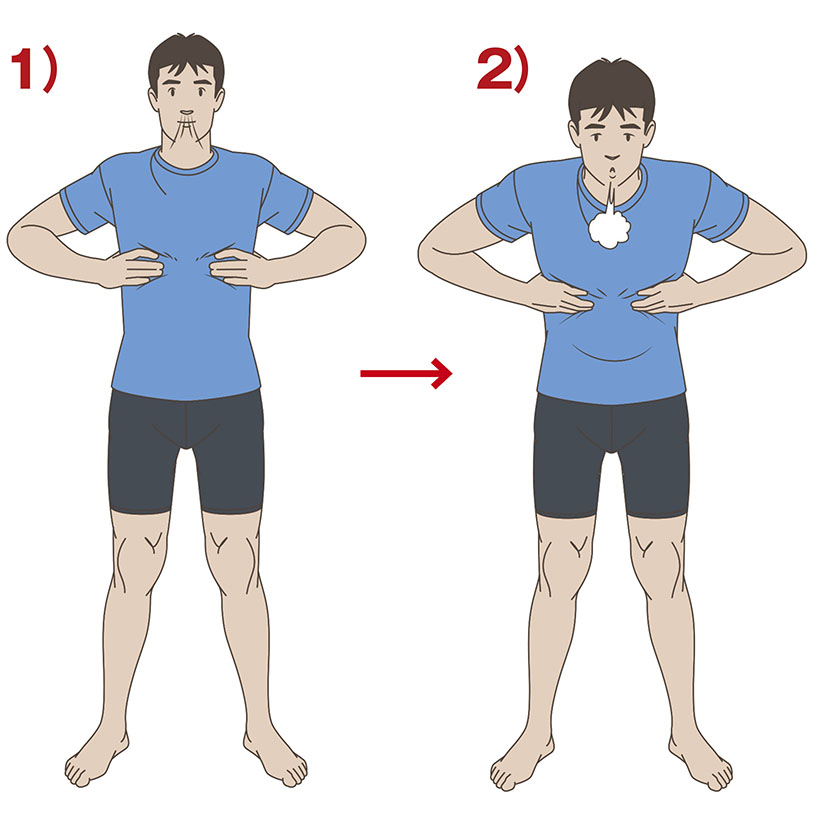 2)肋骨あたりをつかんだまま少し前かがみになり、口からゆっくりと息をはききります