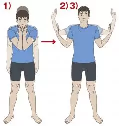 2)ヒジを曲げたまま、手のひらをぐるりと外へ向けながら、両腕を左右に広げます。胸を開き、肩甲骨は中央に寄ります