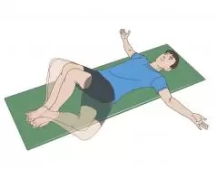 2息を吐きながらゆっくりとヒザを右に倒し、息を吸いながらヒザを戻します。手のひらは、ヒザを倒すのと同時に下に向け、戻すのと同時に上に向けます。背中が浮かないように注意しましょう