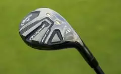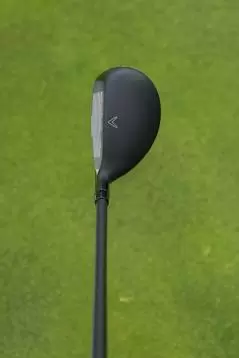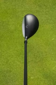 「ヘッドが大きいですね。ヒール側にはシュッと細まってトゥ側に向かってボンと広がっている。洋梨型と言ったらいいですかね。こういう形は先端部に当たるミスヒットに強い。ドローボールが出るイメージも湧きますね。シャフトは軽くて40g台、硬さはSの40インチ。番手は4Hでロフトは21度です」