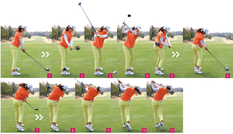 トップから切り返した後、腕だけが先行して動いてしまうとリリースポイントが早くなりやすいのですが、稲見選手のようにインパクトまで右腕が体にくっついていればリリースが早くなることはありません。スイングとしては、アーリーリリースと反対の「レイトヒット」になっているのでインパクトゾーンでヘッドを走らせることができます。