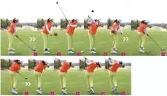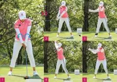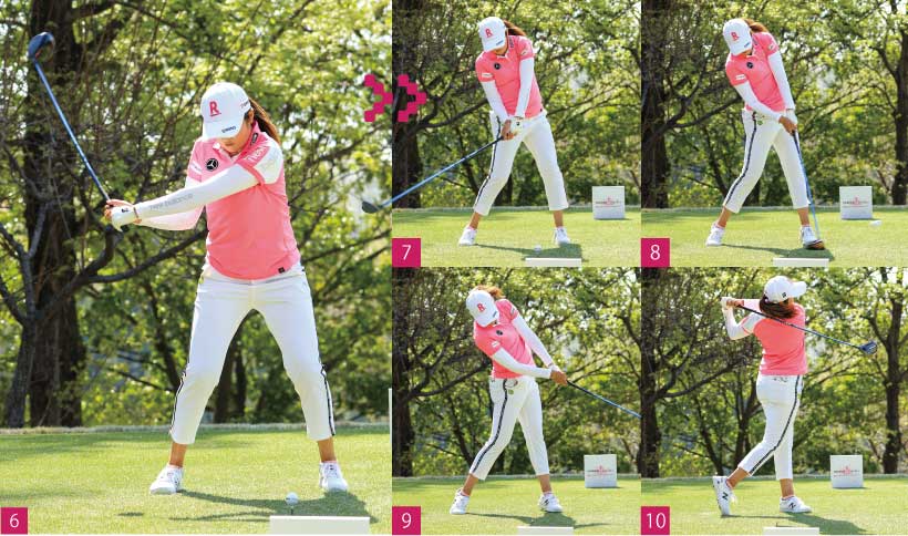 アマチュアはダウンスイングで両ヒザの距離が狭くなってしまう人が多いのですが、稲見選手は両ヒザの距離をトップから少し広げるような感じで打っています(写真4から写真6)。