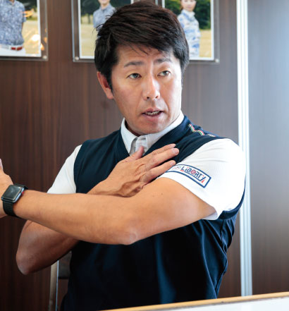 力を入れるのではなくて、ヒネリを入れることがポイントです。写真ではわかりにくいのですが、稲見選手も右腕は右方向(外旋)、左腕は左方向(外旋)に回して構えています。腕を回しておくことで、体との一体感が生まれるので右腕が体から離れにくくなります。
