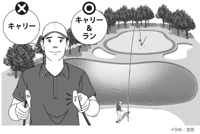 グリーンの状態でランが多く出たり、すぐに止まったりすることもある。トータルの距離はあまり重視せずに、自分のキャリーを把握した上で状況にマッチしたクラブ選択を心掛けよう。(イラスト/庄司猛)