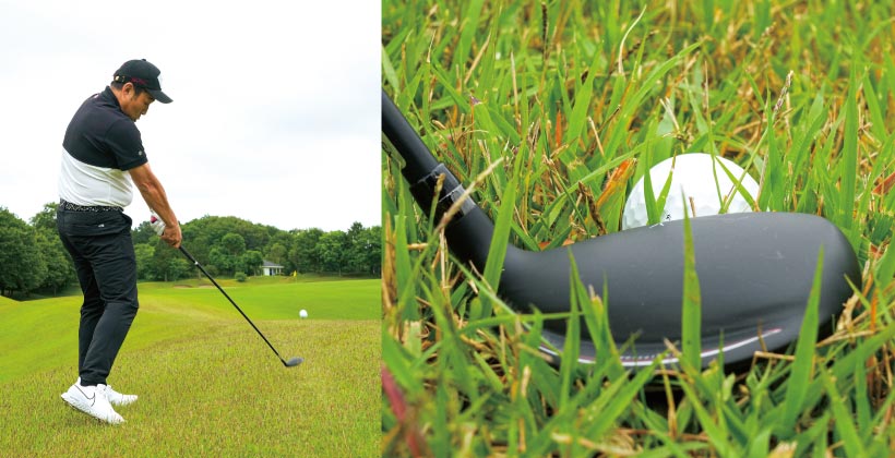 ブレードの効果で抵抗感なくヘッドがボールに届き、滑るように振り抜けます。球が上がるので打球も芝の抵抗を受けにくいから、しっかりキャリーが出ます。