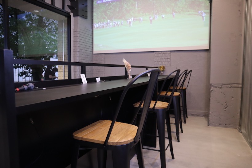 この大画面ではトーナメントの様子などのゴルフに関する映像が流れており、右側にあるカウンターの席ではメンバーさんがいつでも利用できるスペースを設置。練習前後にこのカウンターでお仕事をする方も多いそう。ドリンクが無料で、電源とwi-fiも完備されている。