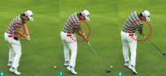 桂川選手のダウンスイングを見ると写真6から写真8にかけてグリップを体に引きつけながらインパクトしています。ヘッドは体から離れようとしているのですが、グリップを体に引きつけることで、両ワキを締めたままインパクトしています。