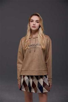 胸にロゴプリントをデザインしたプルオーバーパーカー。光沢感のあるスエード調の素材はストレッチ性に優れ、膨らみ感とシフト風合いが上品な印象。同じ素材のスカートとセットアップコーディネートをして、日常でファッションを楽しむ感覚でゴルフも楽しめるアイテム。