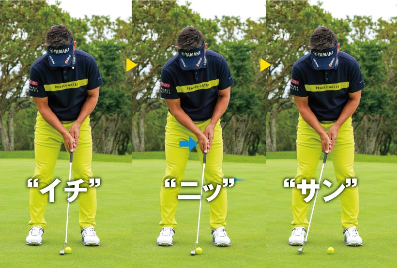 “イチ”で構えて、”ニッ”でフォワードプレス、”サン”でテークバックという流れです。