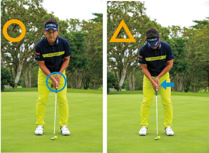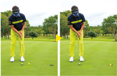 ボールのほぼ真上に手をセットし、ややハンドファーストに構えるのが藤田流(左)。