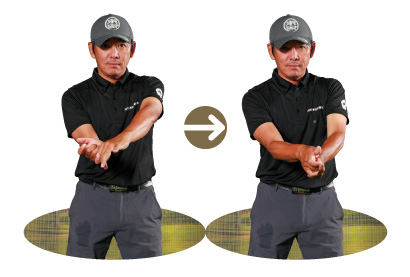 左手を緩めてから締める感覚がつかめたら、いろいろ試そう。「最初、10緩めて10締めていたら、次は5緩めて5締めるとか、3緩めて6締めるとか。グリップの形を変えず、力加減や振り幅の中で、緩め方や締め方を変えてみるんです。