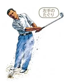 「ホーガンもそうですが、バンカーでは砂の抵抗に負けないよう、手元を流さずに左手のたぐりでヘッドのリリースを促す動きが顕著にみられます。