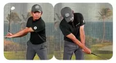 「ただし、左手がたぐり始めると、ヘッドとグリップエンドのテコの動きの〝圧〟が支点2本指にかかってきます。それを押さえながらインパクトを迎えるので〝右手で叩いた〟フィーリングになる、ということもあります」
