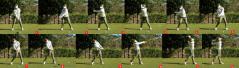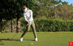 注目して欲しいのはダウンスイングでのキャップのツバ。連続写真を見るとハーフウェイダウンからインパクトまで(写真6-写真8)、キャップのツバの向きがほとんど変わらずにクラブが下りてきています。