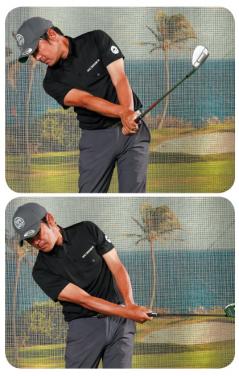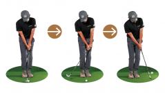 「たとえば、トップで手の位置を高さ1つ分下げてフラットにしようとする場合、最初は右肩より低くするつもり、オーバードゥ(やりすぎ)で練習しないと、なかなか下がりません。中途半端に下げたつもりでは、結局元の慣れ親しんだ形に戻ってしまいます。