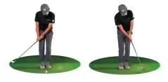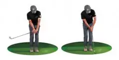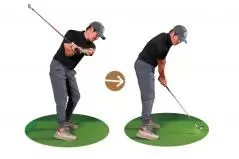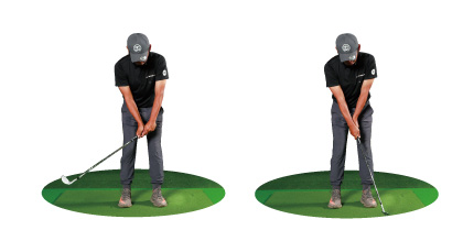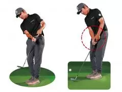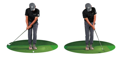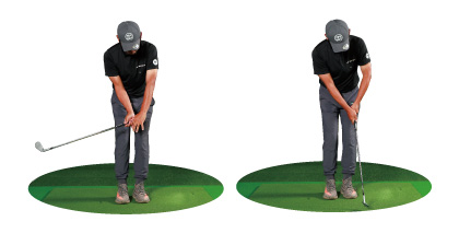 「たとえば、トップで手の位置を高さ1つ分下げてフラットにしようとする場合、最初は右肩より低くするつもり、オーバードゥ(やりすぎ)で練習しないと、なかなか下がりません。中途半端に下げたつもりでは、結局元の慣れ親しんだ形に戻ってしまいます。