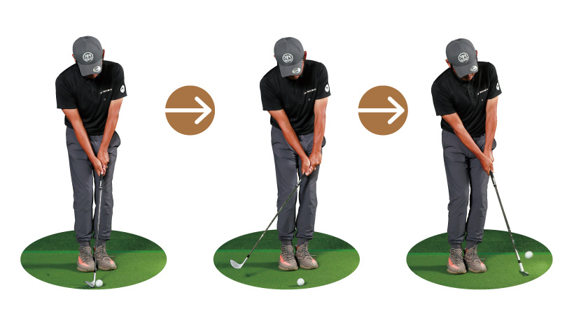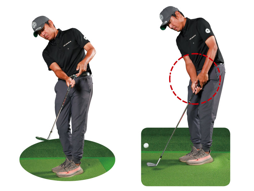 インパクトでグリップエンドを右にたぐり込むとヘッドが強く出る。すくい打ちの感覚。