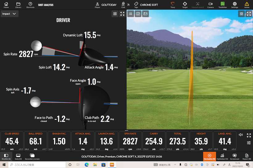 クロム ソフト Xはクラブスピード45.4m/s、ボールに当たった時のロフトが15.5度。ボールを打ち出した角度が13.6度。トータル飛距離は273.5ヤード。