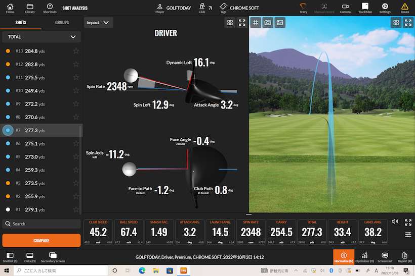 一方、クロム ソフトはクラブスピード45.2m/s、ボールに当たった時のロフトが16.1度。ボールを打ち出した角度が14.5度。トータル飛距離は277.3ヤード。