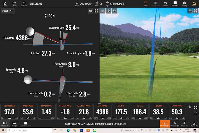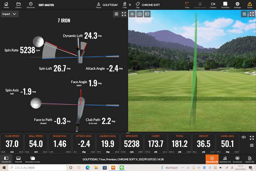 ローグ ST マックス アイアンは、どんなボールでも高く上がって飛ぶと評判ですが、クロム ソフトXを打ってみるとキャリー173.7ヤード。普段より10ヤード飛んでいます。まるでドライバーショットのような高初速でした。