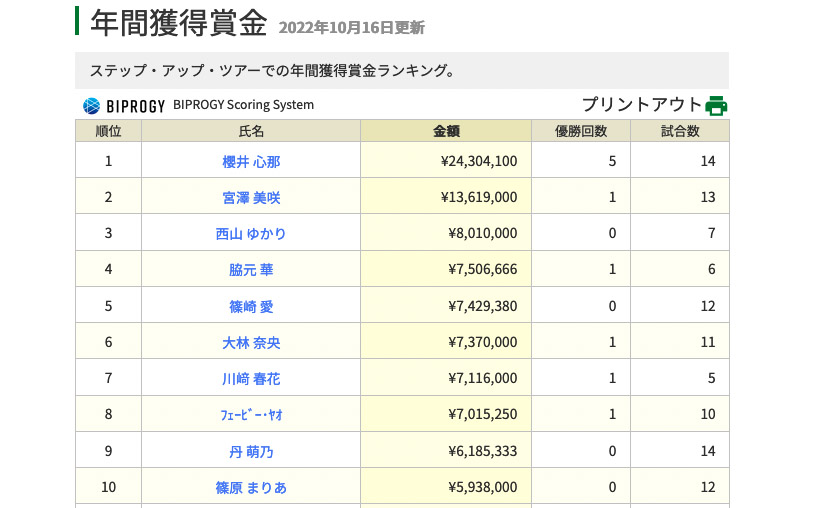 平均ストロークは70.5476で2位に0.9近い大差をつけて独走している。ステップ・アップ・ツアーの年間平均ストローク歴代1位は2019年サイペイイン(台湾)の71.1277。これを大幅に塗り替え、ステップ・アップ・ツアー史上初となる71切りの可能性が膨らんでいる。