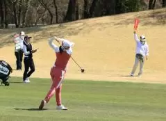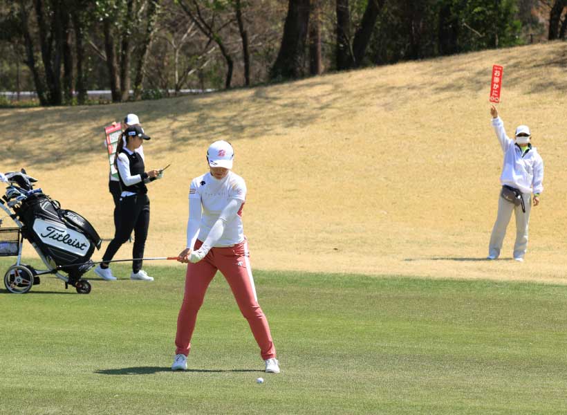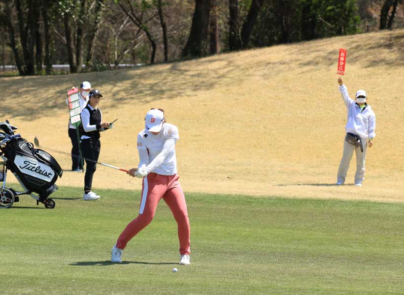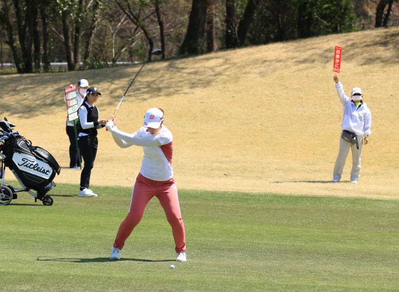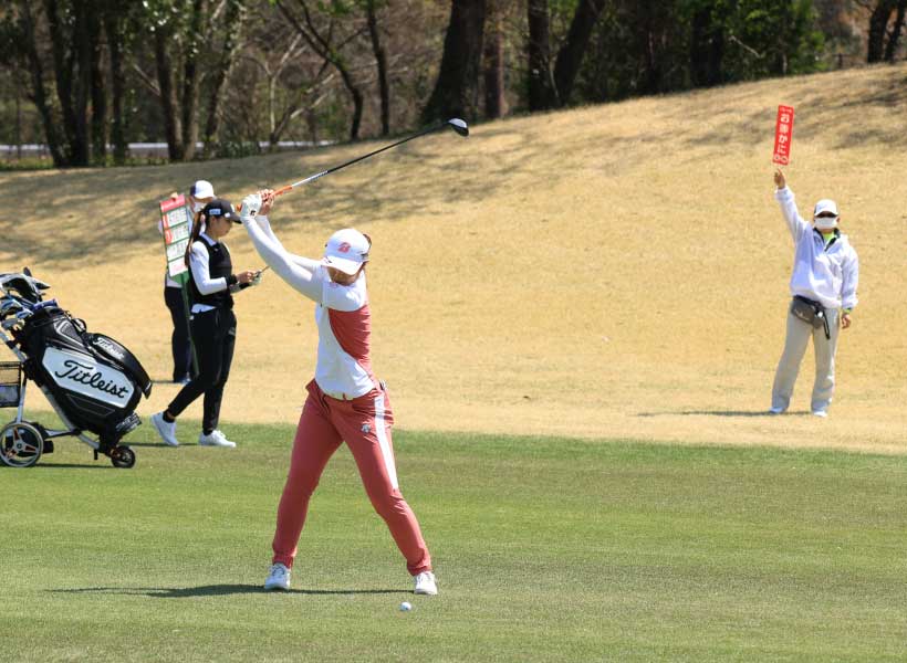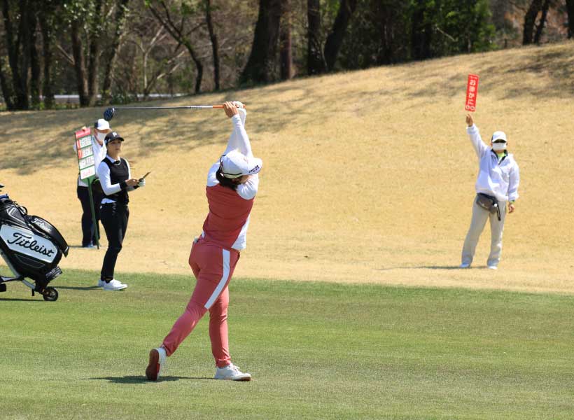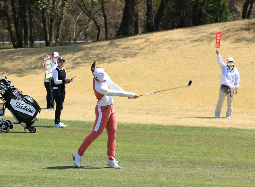 渡邉彩香のフェアウェイウッドスイング(正面)|フォロー①