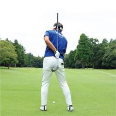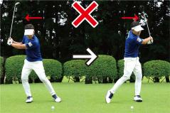 スイング軸をキープするのは軸を左右に動かさないようにするのはもちろん、上下に動かしてもいけません。ポイントは構えたときの頭の高さをインパクトまでキープすること。つまりアドレス時の上体の前傾軸がインパクトまで変わらないようにすることがもっとも重要なのです。バックスイングで上体が浮き上がると、その反動でダウンスイングでは上体が沈み込んでしまいます。頭と地面との間隔が保てず、スイング軌道が大きくブレてしまうのです。頭を動かさないことを意識するなら、頭を上下に動かさないようにすることに着眼してください。頭も顔も少しくらい左右に動くのは許容範囲ですが、頭の上下動は絶対にいけません。