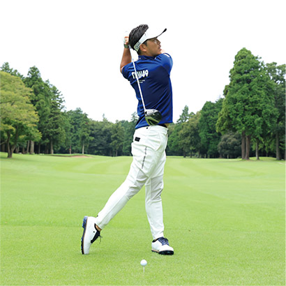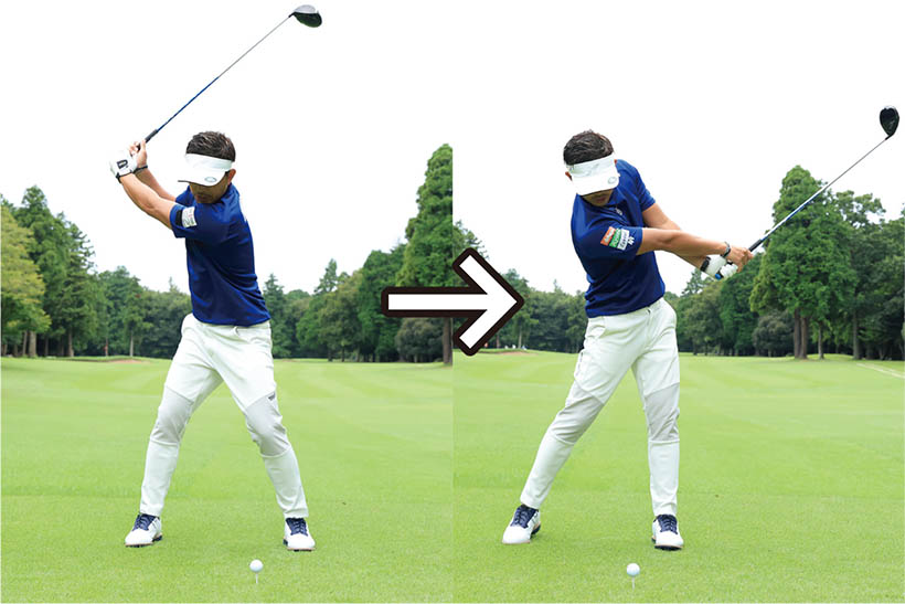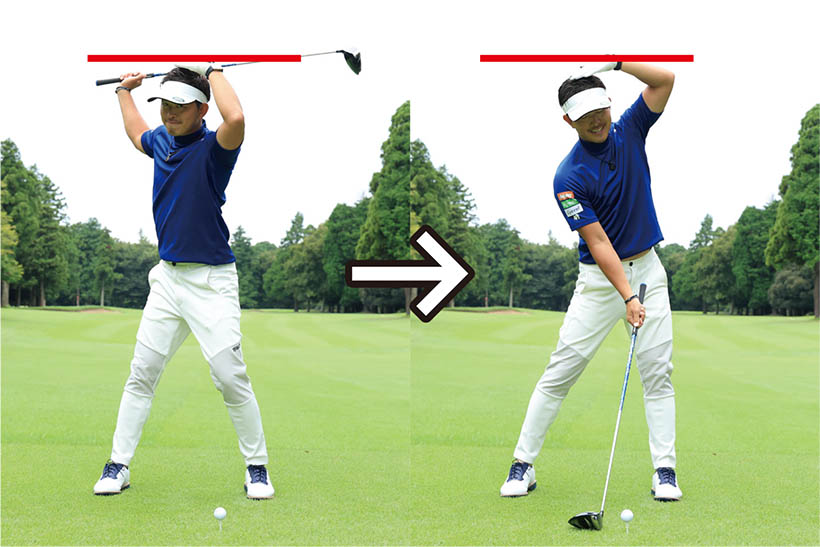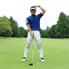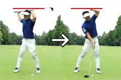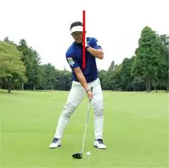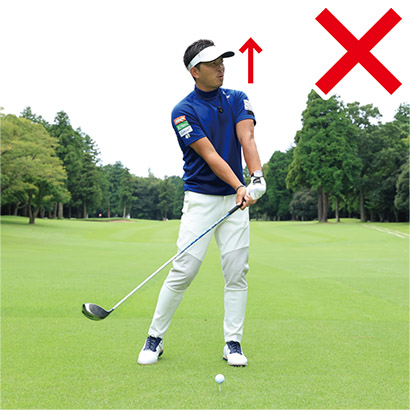 スイング軸をキープするのは軸を左右に動かさないようにするのはもちろん、上下に動かしてもいけません。ポイントは構えたときの頭の高さをインパクトまでキープすること。つまりアドレス時の上体の前傾軸がインパクトまで変わらないようにすることがもっとも重要なのです。バックスイングで上体が浮き上がると、その反動でダウンスイングでは上体が沈み込んでしまいます。頭と地面との間隔が保てず、スイング軌道が大きくブレてしまうのです。頭を動かさないことを意識するなら、頭を上下に動かさないようにすることに着眼してください。頭も顔も少しくらい左右に動くのは許容範囲ですが、頭の上下動は絶対にいけません。
