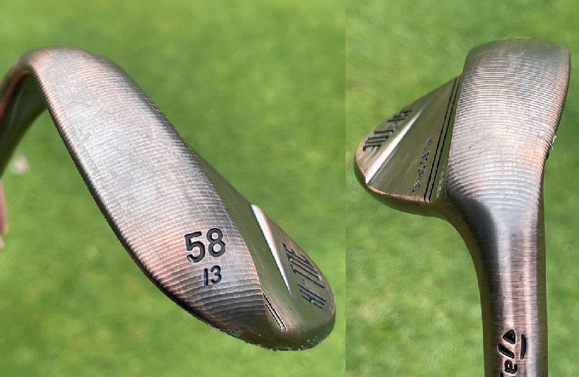 バックフェースはカッパー仕上げになっているのに、フェース面は「ロウフェーステクノロジー」を採用したノーメッキ仕上げ。それに加えて「レイズドマイクロリブ」という、フェース面に無数に搭載されたバー状の突起により、ヘッドスピードが遅いグリーン周りからのアプローチでもスピン量がアップするのだとか。