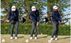 (1) 60ヤード以内のアプローチでも胸をきちんと回すことが大切。