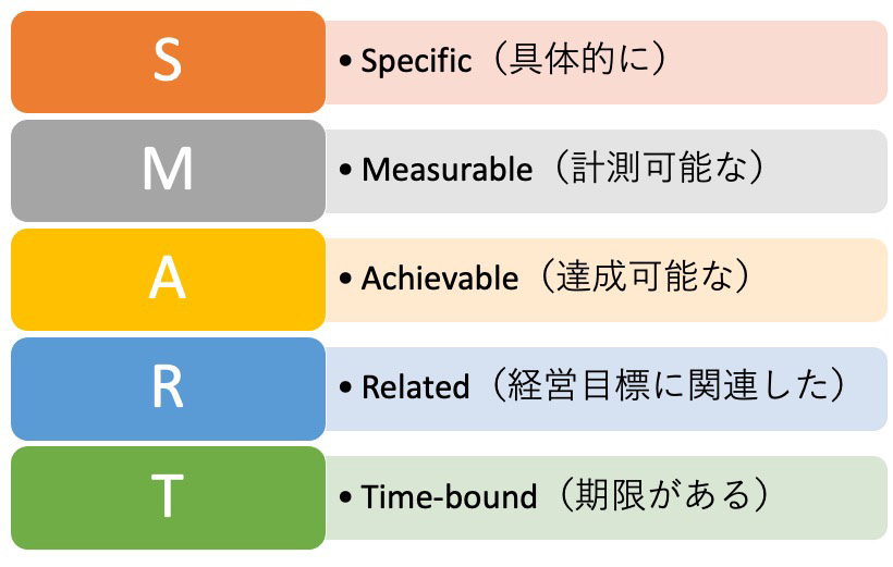 PDCAサイクルを回す上で最も重要なのが、Planのステップでの目標設定です。目標設定に有効なビジネスフレームワークがSMARTです。SMARTはSpecific(具体的に)、Measurable(計測可能な)、Achievable(達成可能な)、Related(経営目標に関連した)、Time-bound(期限がある)の頭文字を取ったものです。