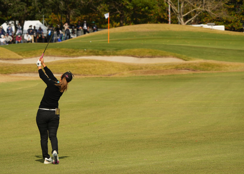 最終組と最終組一つ前の6人は、今季メルセデスランキング1~5位の山下美夢有プロから勝みなみプロまでの5名と、ルーキーで今季は少ない18戦の中2勝した川﨑春花プロ。そのメンバーが、ティーイングエリアに一堂に会している情景は、まるで相撲の千秋楽の三役揃い踏みのようです。
