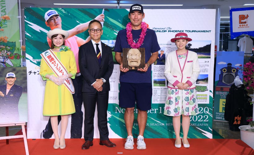 ダンロップフェニックストーナメントの前年度覇者、チャン・キムが昨夜(11月14日)に宮崎入りし、歓迎セレモニーが実施された。会場は宮崎ブーゲンビリア空港・オアシス広場。主催は、みやざきゴルフパラダイス実行委員会(公益社団法人 宮崎市観光協会)。